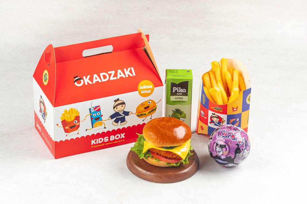 Бургер, фри, сок, кетчуп, игрушка.