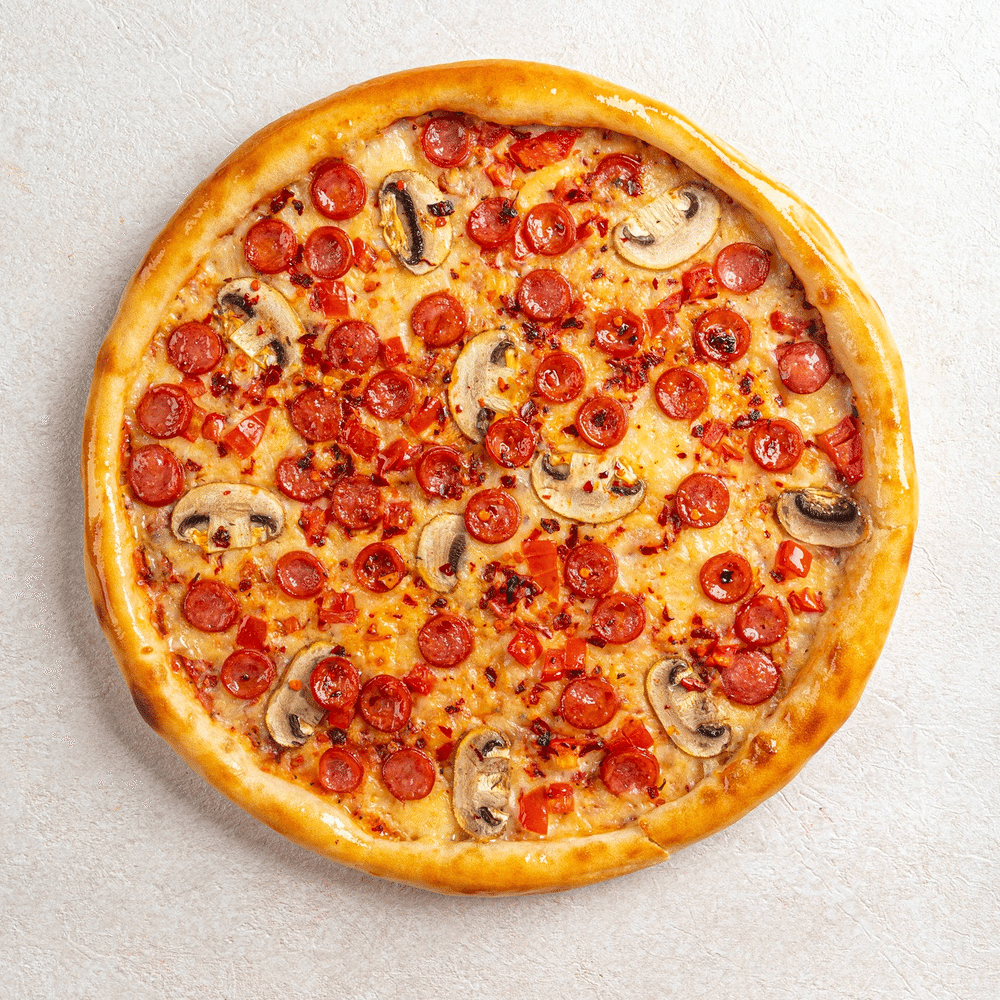 Томатный соус, охотничьи колбаски, грибы, помидоры, сыр моцарелла На выбор: Средняя острота, острая