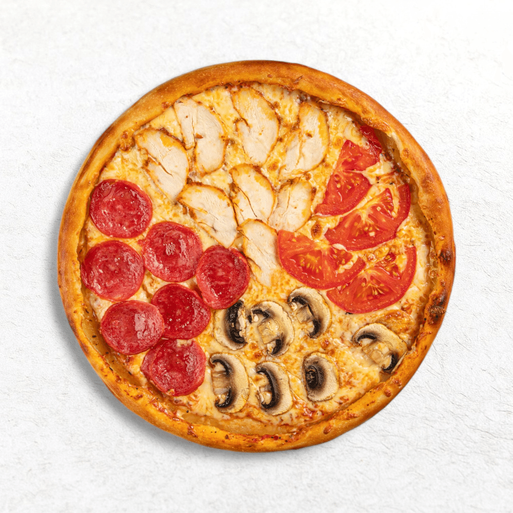 Томатный соус, колбаски, запечённая курица, помидоры, грибы, сыр моцарелла