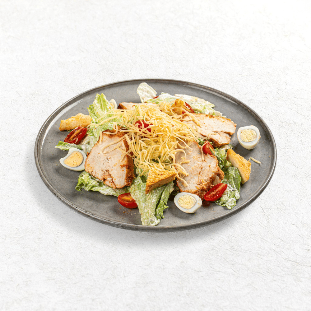 Запечённая курица, айсберг, перепелиные яйца, помидоры черри, соус цезарь, пряные сухари, пармезан