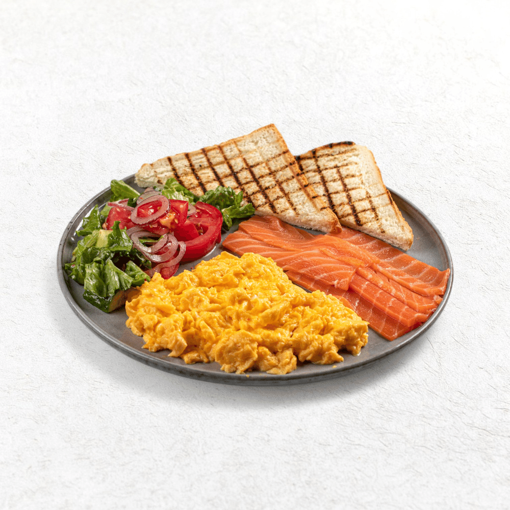 Свежий салат, копченая семга, скрембл, тосты