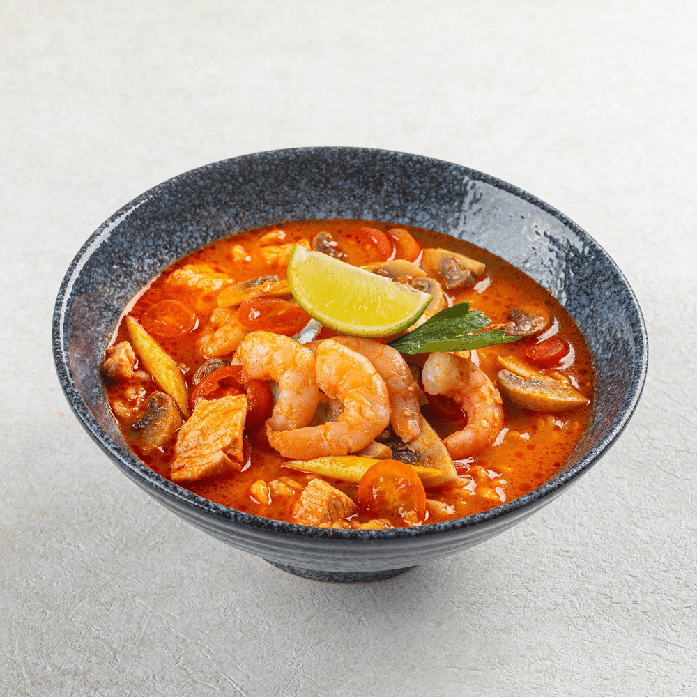 Кокосовое молоко, лемонграсс, грибы, имбирь, лайм, черри, семга, креветки