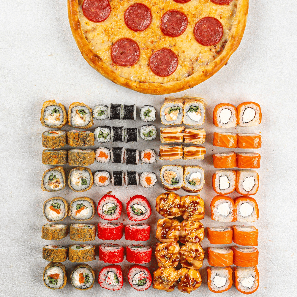 72 ролла + Пепперони в подарок Филадельфия - 8 шт Филадельфия - 8 шт Калифорния - 8 шт Лосось темпура - 8 шт Угорь темпура - 8 шт Капа маки - 8 шт Саки маки - 8 шт Яссай темпура курицей- 8 шт Самурай - 8 шт
