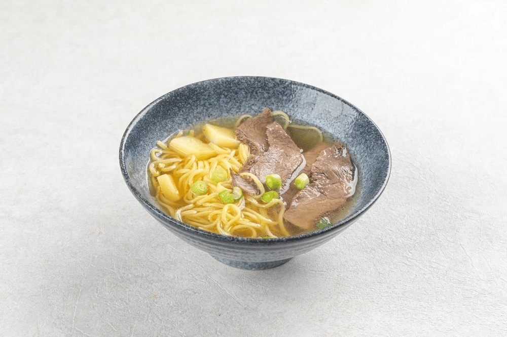 Нежная отварная говядина, пшеничная лапша и картофель в ароматном бульоне с добавлением зелёного лука