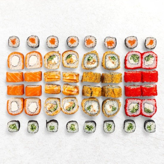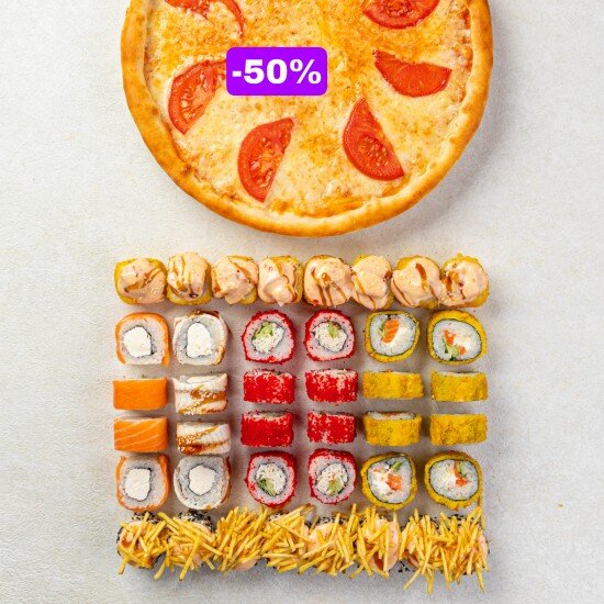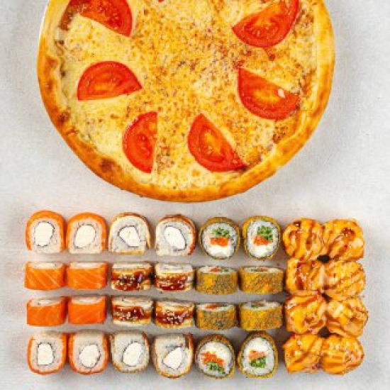 40 роллов + Пепперони + Coca-cola 1 л. в подарок Филадельфия ролл - 8 шт Поцелуй гейши - 8 шт Канада - 8 шт Яссай темпура с курицей - 8 шт Аляска запеченная с лососем- 8 шт