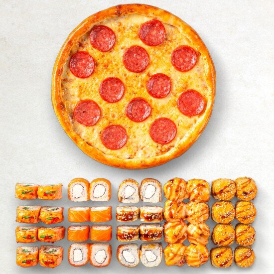 40 шт + Маргарита+ Coca-cola 1 л. Филадельфия микс - 8 шт Калифорния - 8 шт Лосось темпура - 8 шт Яссай темпура с курицей - 8 шт Картофель пай с курицей - 8 шт Маргарита Кола 1 л