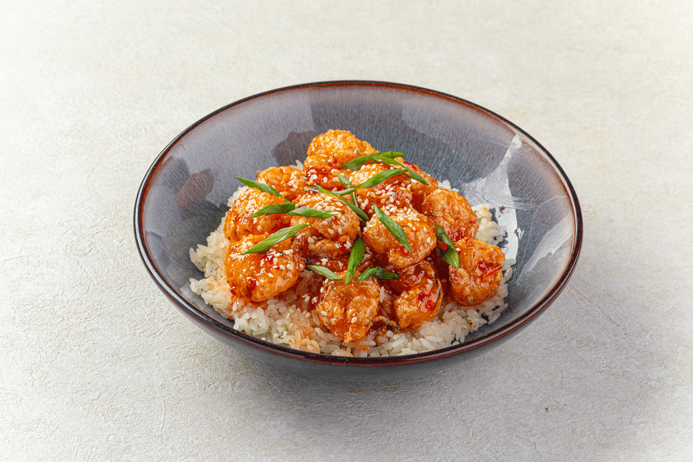 Креветки в хрустящем кляре, обжаренные в кисло-сладком соусе. Подаются с рисом, посыпаются зелёным луком и кунжутом