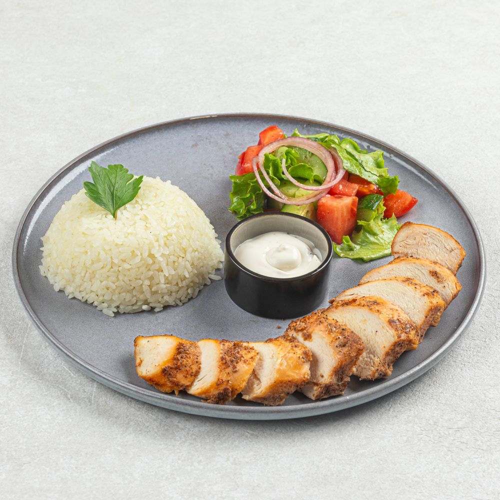 Запечённая куриная грудка, свежий салат, белый соус, гарнир на выбор: рис/ гречка.