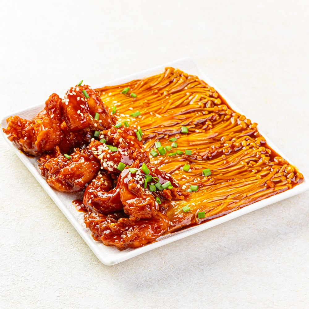Острые хрустящие креветки в корейском соусе яннём с обжаренными грибами эноки. Украшается кунжутом и зелёным луком