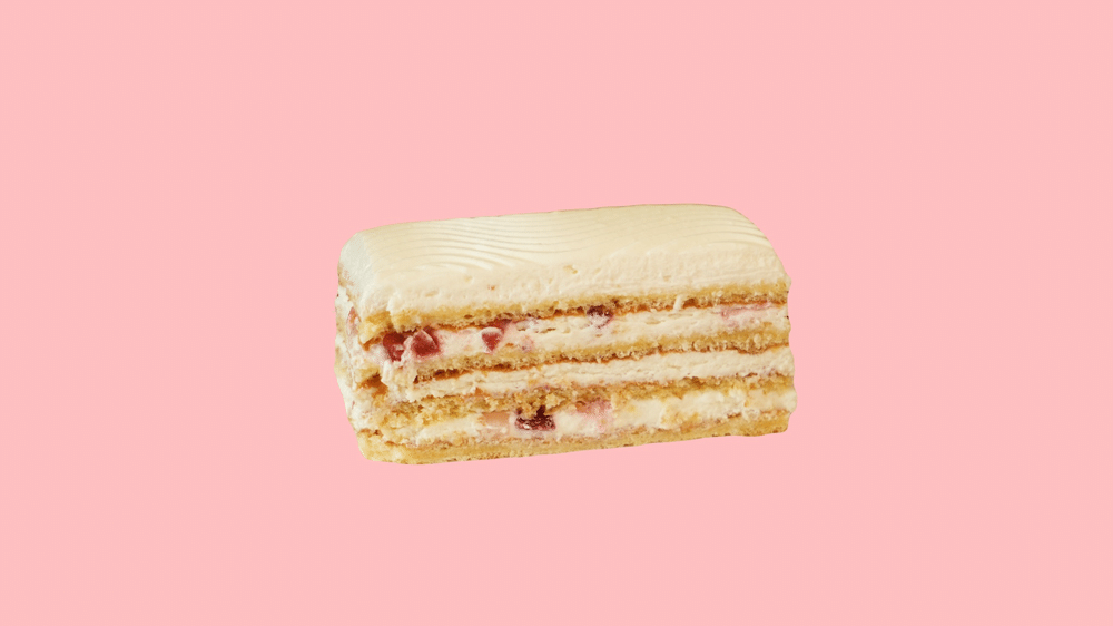Нежный бисквит, пропитанный легким белково-сливочным кремом, с прослойкой из свежей клубники 160 гр
