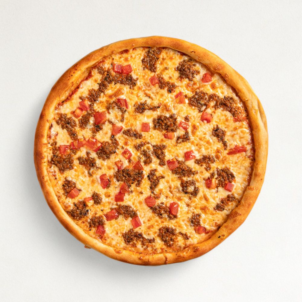Томатный соус, сыр «Моцарелла», говяжий фарш, помидоры