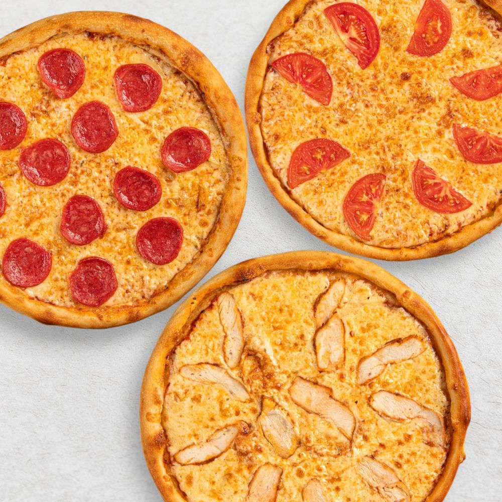 Пицца «Пепперони» (30 см), пицца «Маргарита» (30 см), пицца «Куриная в сливочном соусе» (30 см), Coca-cola (1 л)