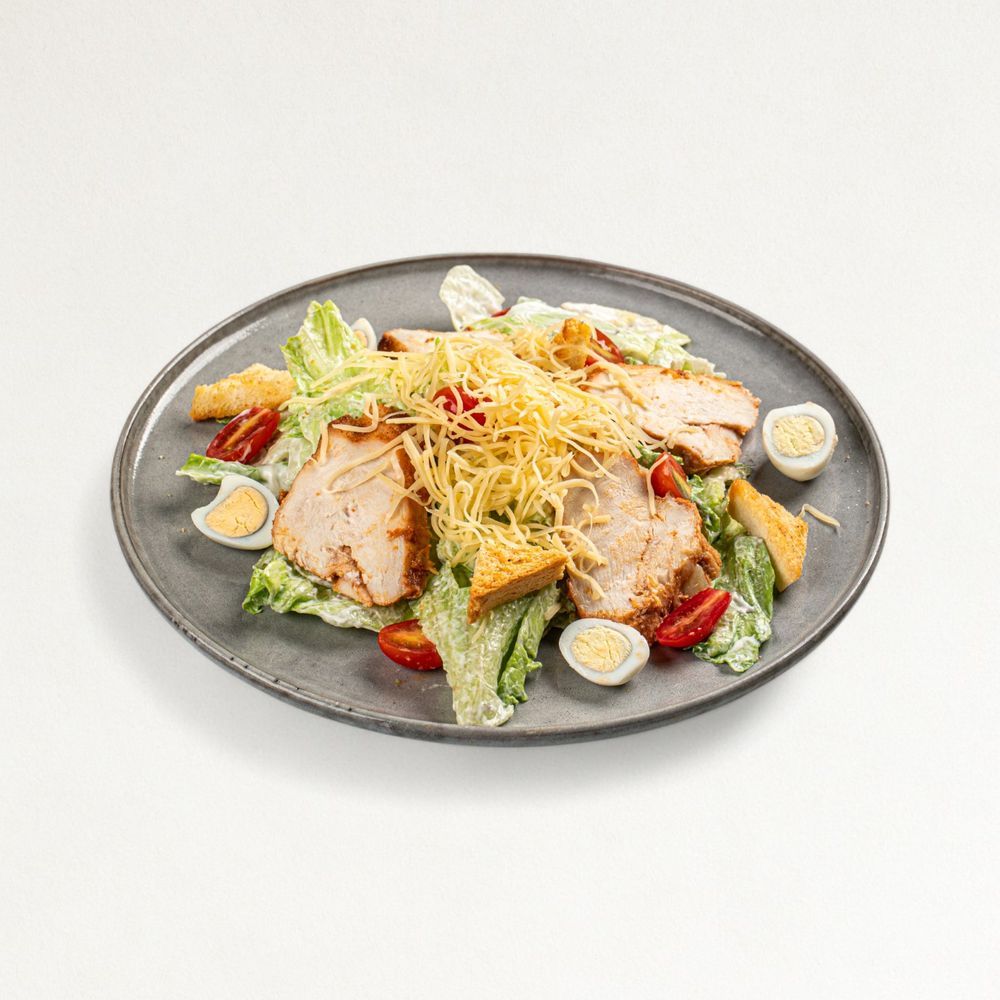 Запеченная курица, айсберг, перепелиные яйца, помидоры черри, соус цезарь, пряные сухари, пармезан