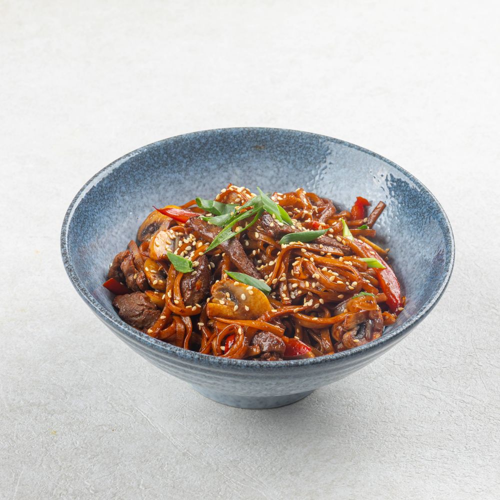 Говядина, лапша пшеничная, болгарский перец, грибы, соевый соус, соус терияки, кунжут
