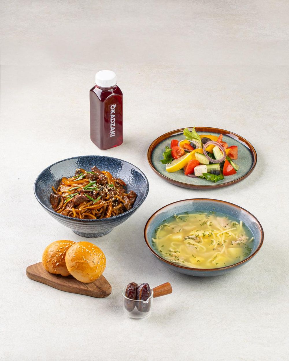 Куриный суп Удон с говядиной Греческий салат Дрожжевые булочки - 2 шт Морс - 0,3 Финики