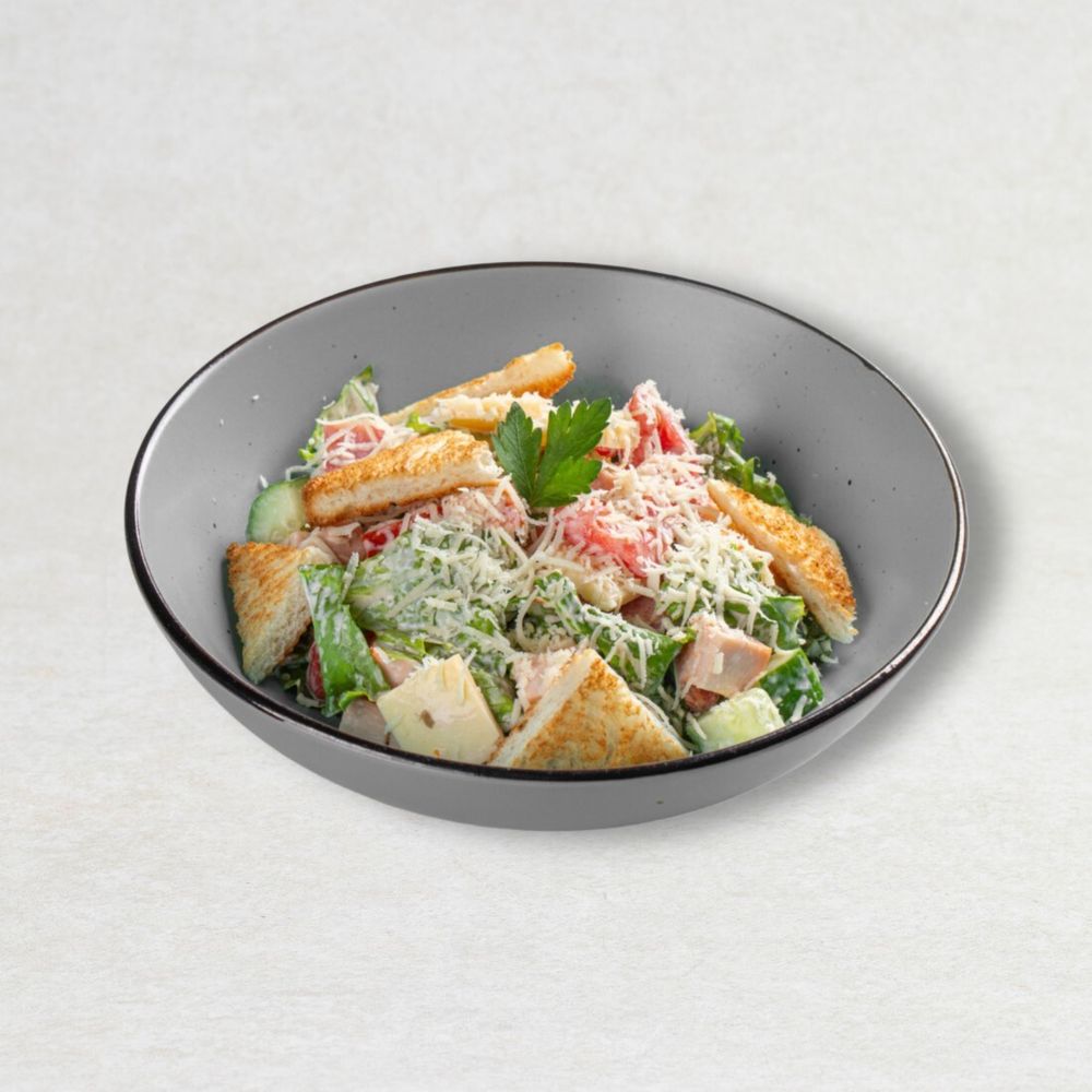 Сыр гауда, копченая курица, огурцы, помидоры, листья салата, сухари фирменные