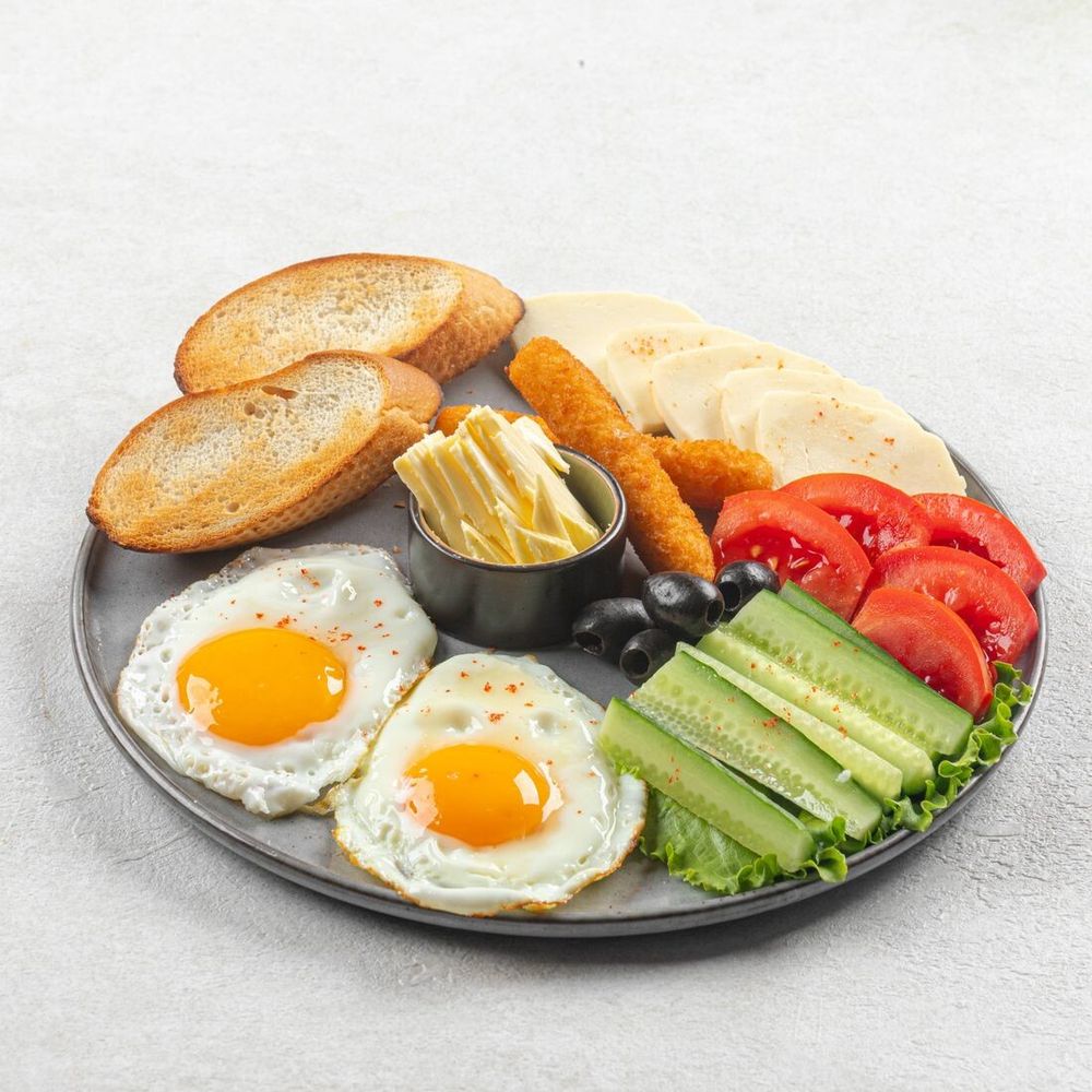 Глазунья, свежий салат, зелень, брынза, оливки, масло, багет, сырные палочки