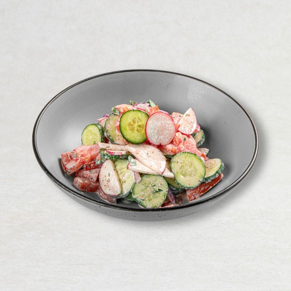 Помидоры, огурцы, редис, красный лук, зелень, сметана