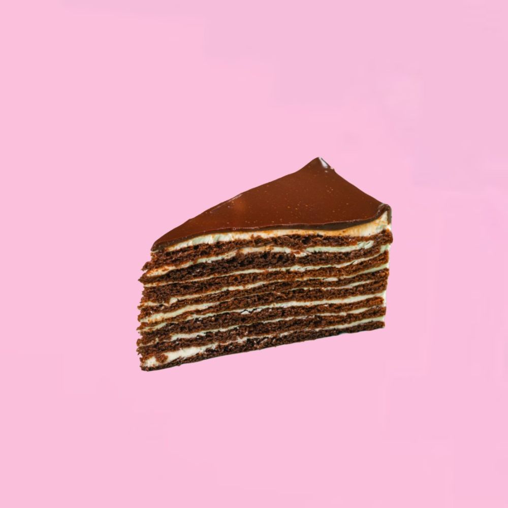 Нежный шоколадный масляный бисквит, пропитанный насыщенным заварным сливочным кремом “Пломбир”. Десерт украшен шелковистым ганашом из бельгийского молочного шоколада.
