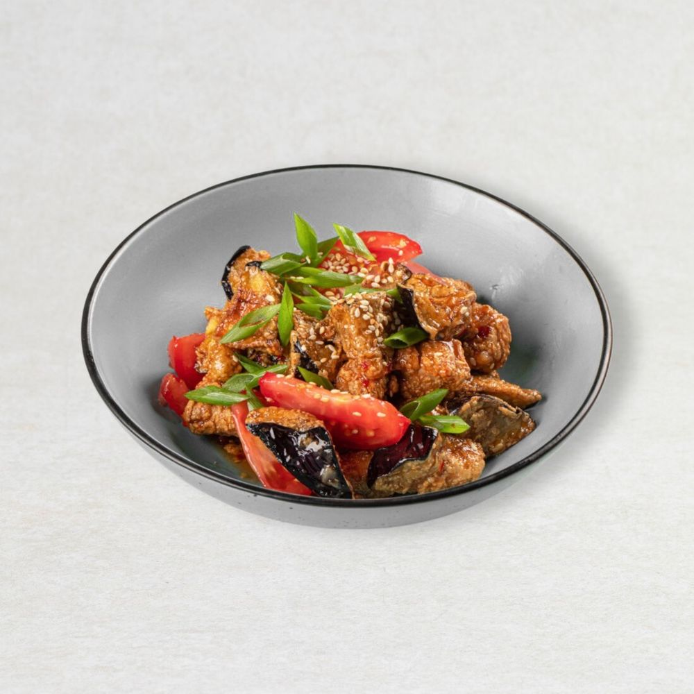 Баклажаны, курица, помидоры, кисло-сладкий соус, кунжут, зеленый лук