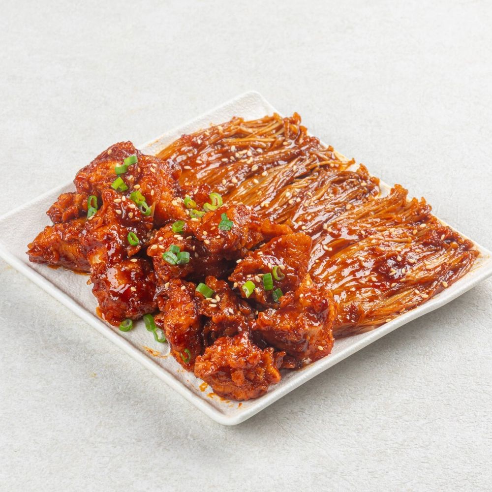 Острые хрустящие кусочки курицы в корейском соусе яннём, подаются с грибами эноки, посыпаются кунжутом и зеленым луком